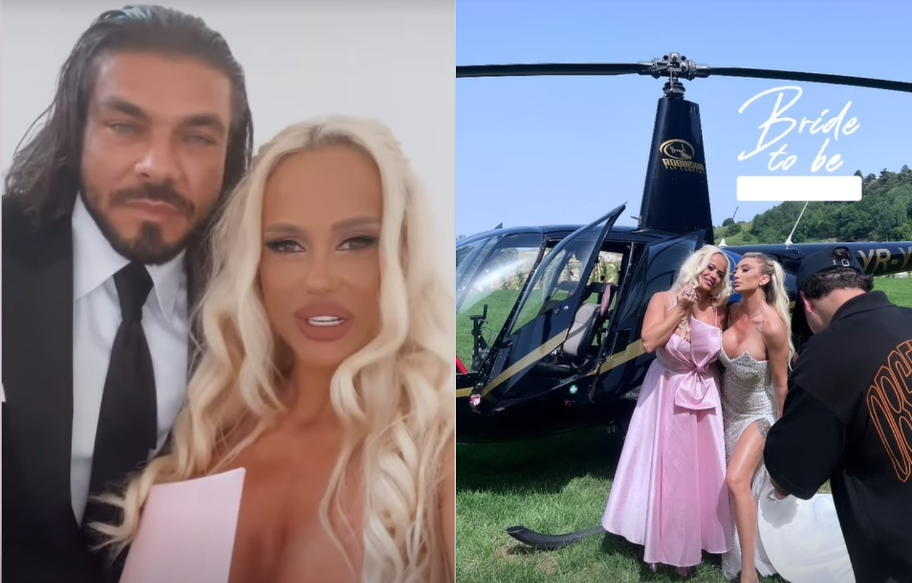 Evenimentul a fost unul excentric, mireasa a ajuns cu elicopterul la nuntă, iar mirele, cu mașina lui roșie, marca Lamborghini.